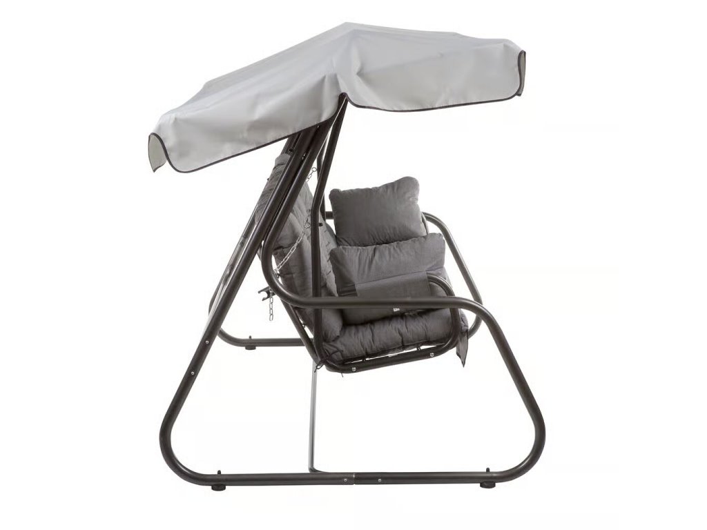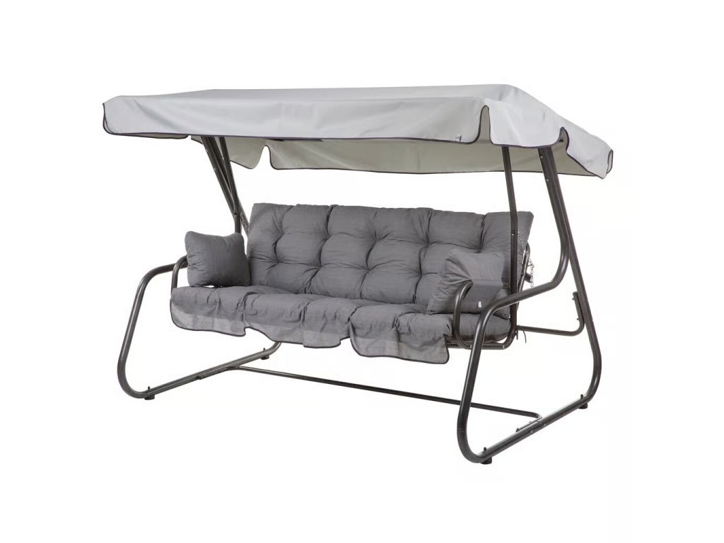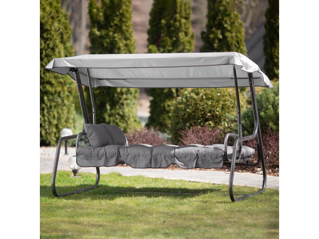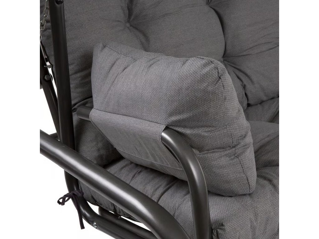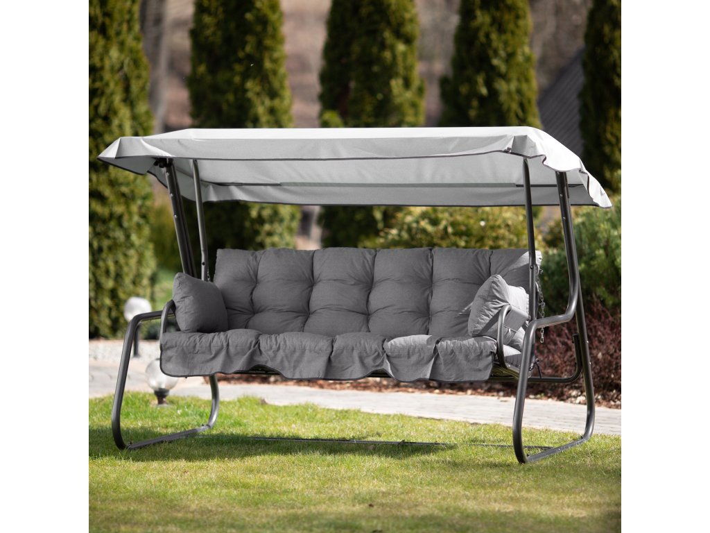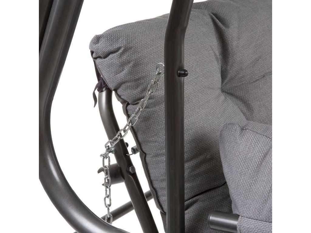 Sedadlo houpačky lze rozložit do polohy vleže na zádech a umožnit tak odpočinek až pro 2 dospelé osoby. Dva prošívané hrubé sedáky a přídavné područky v jednolité šedé barvě jsou vyplněné řezanou houbičkou Flocke a zaručují dobrý odpočinek. Vrch i spodek sedáků je vyrobený z bavlněno-polyesterové tkaniny (48% bavlna, 52% polyester), která je pevná a odolná. Pevný rám s práškovým nástřikem zaručuje stabilitu a odolnost vůči povětrnostním vlivům.