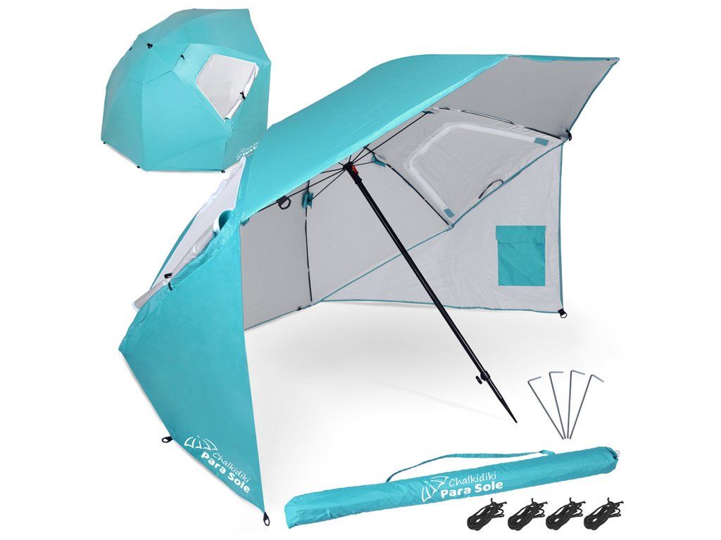Slunečník Chalkidiki je vyroben z materiálů nejvyšší kvality, což zajišťuje jeho dlouhou životnost a spolehlivost. Pevná konstrukce a polyester se stříbrnou ochrannou vrstvou efektivně chrání před UV zářením a odolává rozmarům počasí. Myslíme na váš komfort – slunečník disponuje dvěma okny s moskytiérou a větracími otvory, které zajišťují vynikající cirkulaci vzduchu. Vnitřní kapsy navíc nabízejí praktický prostor pro uložení nápojů, svačiny a dalších drobností, ať už jste s dětmi nebo si užíváte klidnou chvíli sami.