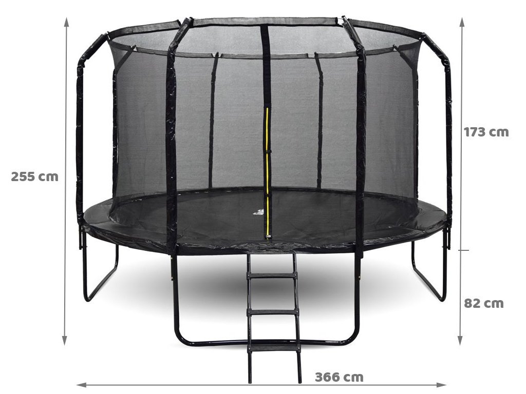 Zahradní trampolína SkyFlyer Black 366 cm se sítí a profilovanými sloupky je nabídkou pro všechny, kteří mají rádi a oceňují dobrý pohyb. Je všeobecně známo, že cvičením posiluje zdraví, zvyšuje endorfiny, pozitivní přístup - vše je dobré. Proto je taková trampolína ve vaší zahradě fantastickým motivátorem k pohybu vašeho vlastního těla! Není na co čekat - tato trampolína umožní vám i vašim dětem být ve skvělé kondici a formě. Při výběru trampolíny byste měli vzít v úvahu počet dětí hrajících si na trampolíně. Velikost trampolíny 366 cm bude perfektní i pro čtyři nebo pět dětí. Taková trampolína bude bezpečná, nezabere mnoho místa a zábava bude neskutečná. Místo pro trampolínu musí být rovné, bez stromů a větví nad trampolínou. Stačí tedy metrem označit prostor určený pro trampolínu, abyste si vizuálně představili prostor, který trampolína zaujme. Pravidlem je, že čím větší je velikost, tím větší je prostor pro skákání. Trampolína se dodává ve dvou kartonech - krabicích.