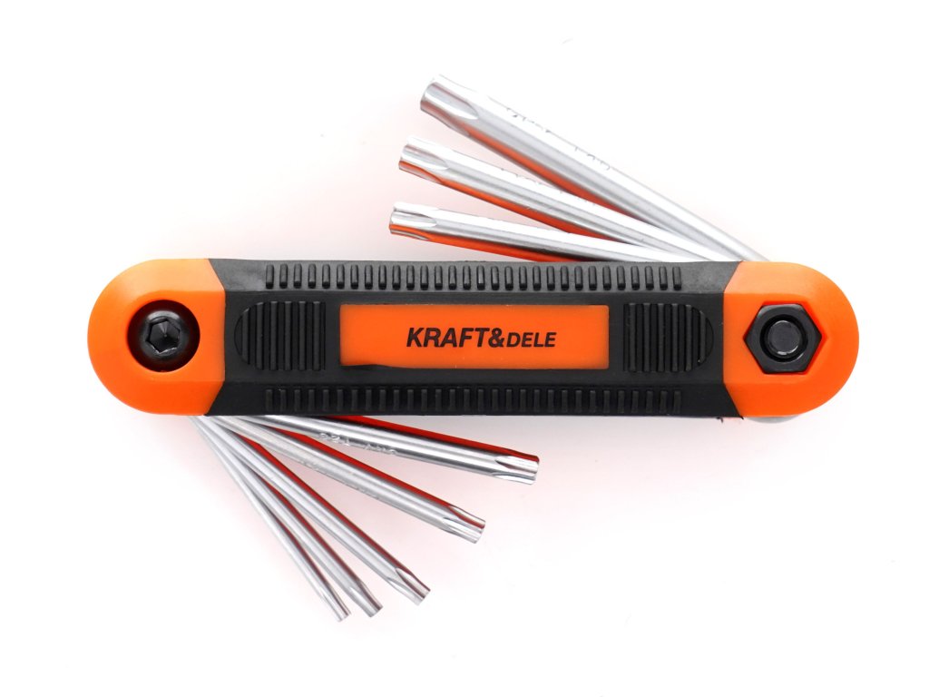 Zestaw składanych imbusów marki Kraft&Dele model KD11935 posiadają specjalną końcówkę z otworem dostosowanym do współpracy że śrubami typu TORX.
