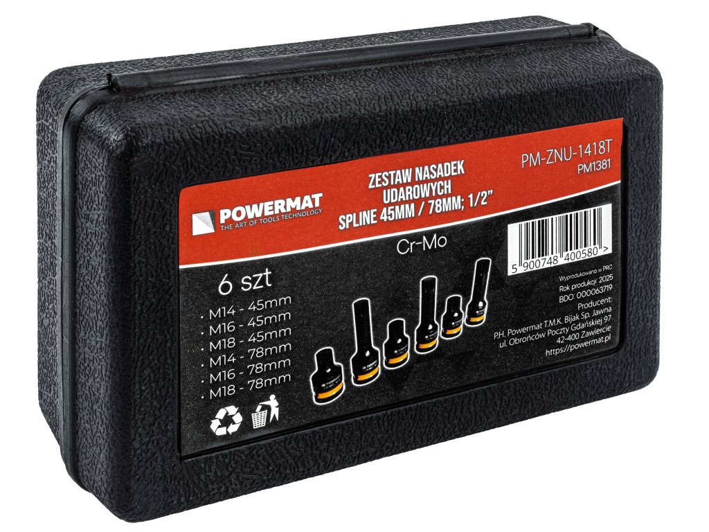 Zyskujesz 6 nasadek udarowych spline w rozmiarach M14, M16 i M18, każdą w dwóch długościach 45 i 78 mm, co pozwala Ci precyzyjnie dopasować narzędzie do każdej śruby. To mniej przerw w pracy i większa efektywność przy kluczu udarowym.