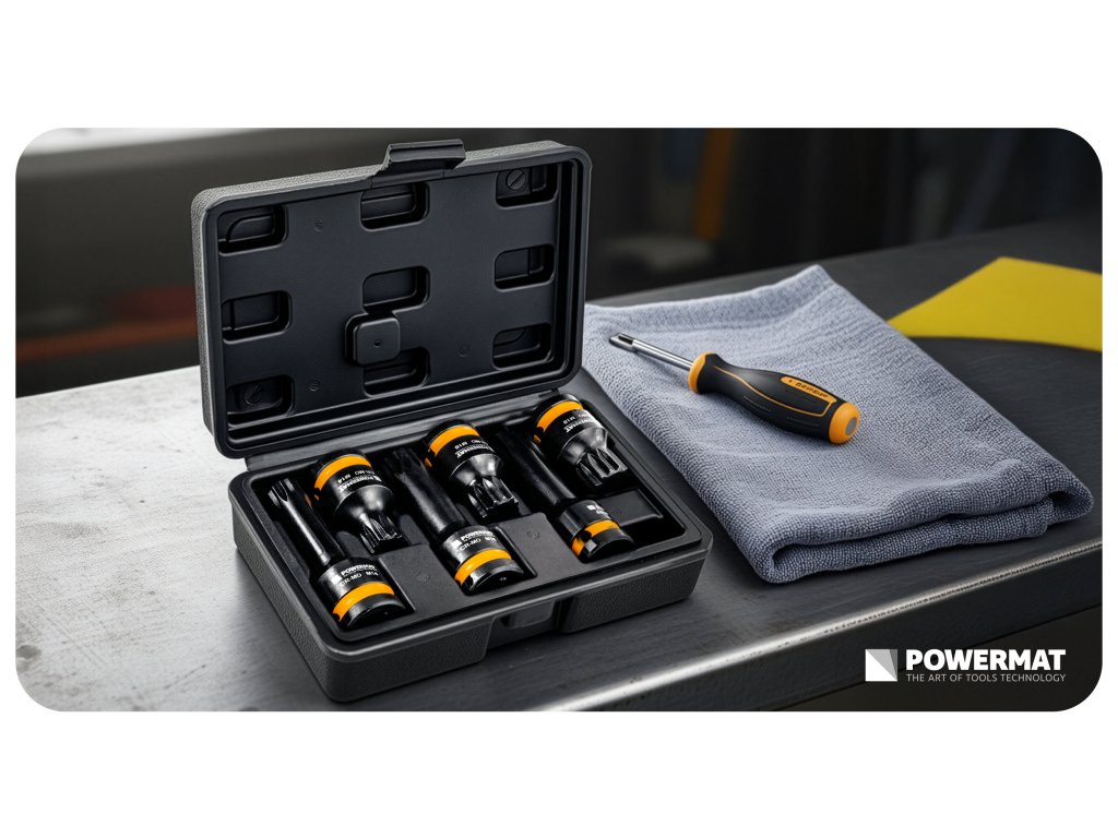 W komplecie znajduje się walizka transportowa, która ułatwia przechowywanie i przenoszenie nasadek.