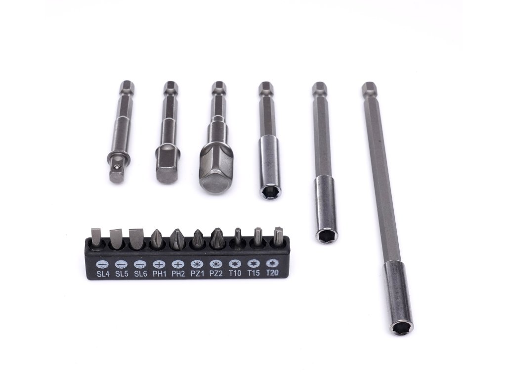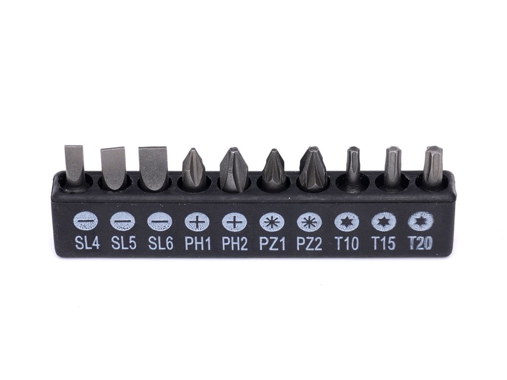 ✅ 16 elementów: bity, uchwyty i adaptery SL4, SL5, SL6, PH1, PH2, PZ1, PZ2, T10, T15, T20,